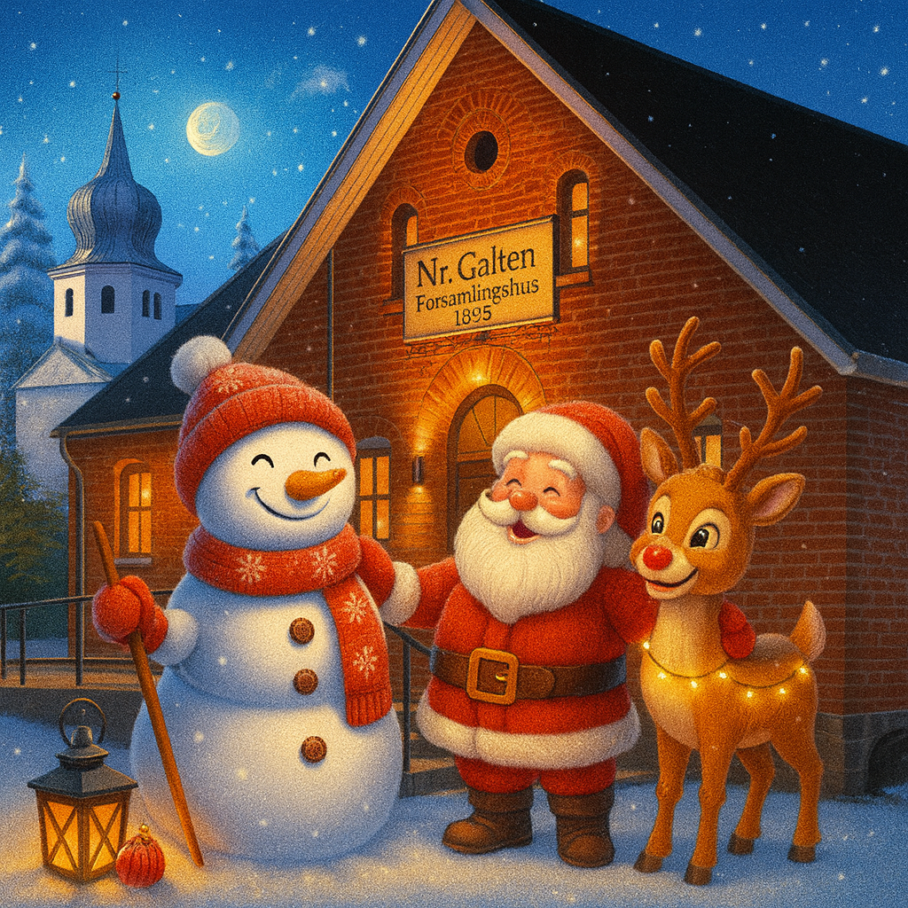 Vi starter kl. 09.30 i Nr. Galten Forsamlingshus. Her synger vi julen ind sammen med vores præst Lise. (Vi bruger forsamlingshuset, da Nr. Galten Kirke desværre er lukket i øjeblikket.)